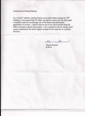 If you ever need a little help convincing a patient, I would be very pleased to speak to them! there are thousands of people out there that do not have a clue what this procedure could do for them…..it is virtually painless, and something one can do to improve their life, sometimes dramatically! Also, unlike a new car, whose value goes down every year, cosmetic dentistry continues to “give back” every single day! It is intensely personal, yet on view for all the world to see! Almost a decade after my restoration, a week seldom passes that I don’t receive compliments from others. Even my teenage grandaughter, who gave my picture to her orthodontist with instructions that she wanted her mouth to look “just like my Grandma’s”! Thank you again, Dr. Mike for everything.
